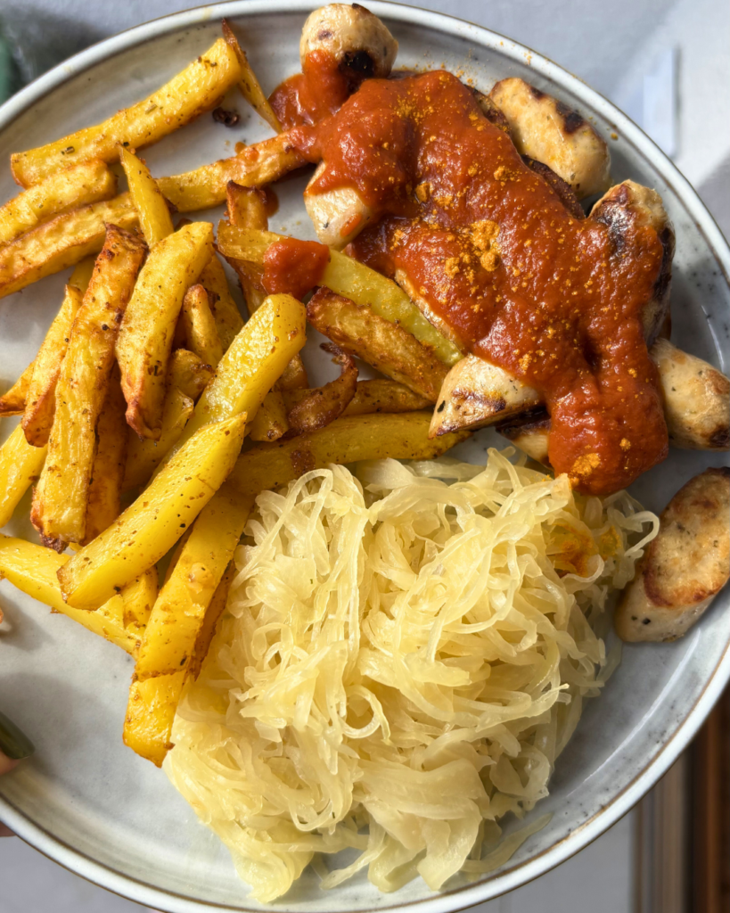 Als dreifache Mutter weiß ich, dass Kinder zwischendurch gern einmal Fast Food möchten. Pommes mit Currywurst stehen dabei hoch im Kurs. Aber warum nicht gesund, lecker und selbstgemacht? Mit frischem Gemüse, selbst gemachten Pommes oder Ofenkartoffeln und meiner schnellen veganen Currywurst-Sauce können wir genau das – ein Gericht, das alle lieben, aber trotzdem vollwertig ist.